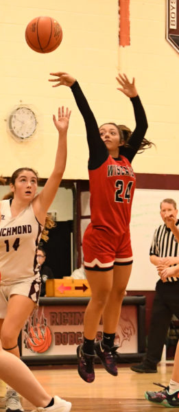 Jessie Rhinebolt launches a shot during Wiscasset’s 32-30 loss to the Bobcats on Thursday, Dec. 4 in Richmond. (Mic LeBel photo)